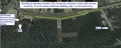 This move is at the direction of our landlord, the New York City Department of Transportation, and is being done to accommodate pier construction and to help alleviate congestion. BMB is just a short three blocks south of Pier 11. The new location offers a weather-protected waiting area, better access to subway stations at South Ferry and Bowling Green, easy access to grab and go food and beverage options, and public restrooms located in the Staten Island Ferry terminal next door. Seastreak will be the only ferry operator utilizing Slip 5 at BMB, which will provide better waiting and boarding experiences for you. Please note that the Seastreak entrance is around the corner on the south side of BMB.