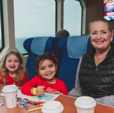 A tasty brunch will be available to all passengers on the way north to the city. A yummy, kid-friendly menu including macaroni and cheese, chicken fingers, pigs in blankets, and scrumptious holiday treats will be served. For the adults, we will have waffles, bacon cheddar & spinach frittatas, fresh fruit and more. Head over to the full service bar for holiday drinks and refreshments!